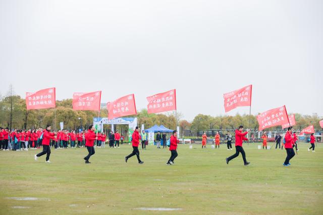鲜红旗帜书写响亮口号,响亮口号彰显昂扬斗志。各工厂、各单位旗手代表挥舞旗帜,冲锋而来。